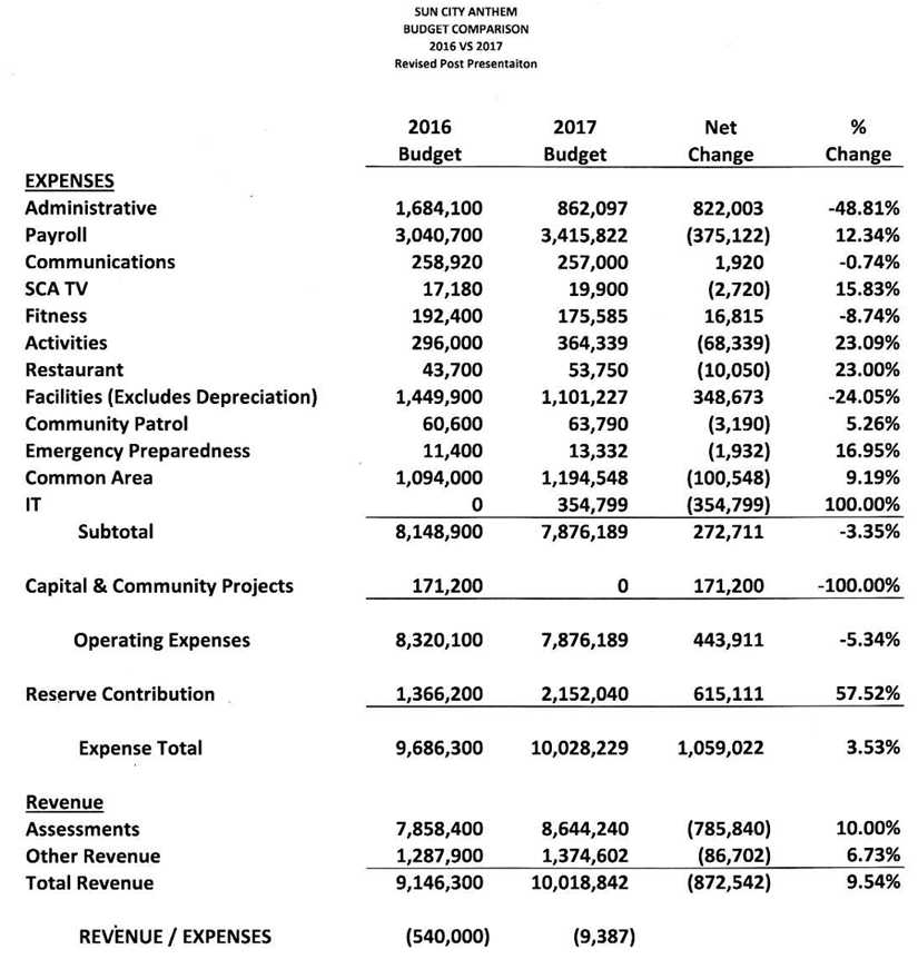 The table below compares the 2016 Budget to the proposed 2017 Budget, showing the dollar and percentage changes.