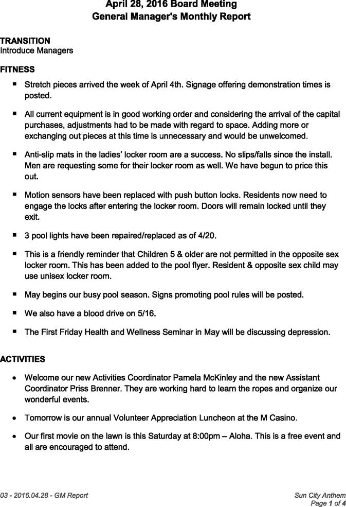 Special Board Discussion Session, at 9:00 am The meeting will discuss efforts to implement Self-Management(SM) at Sun City Anthem, focusing on two areas: 1) changes to the Policy Manual; and 2) changes to the role of the Board. Future meetings will focus on how SM will impact the Committees, Clubs and other groups.
