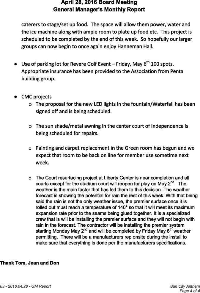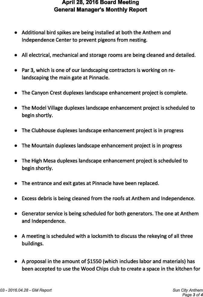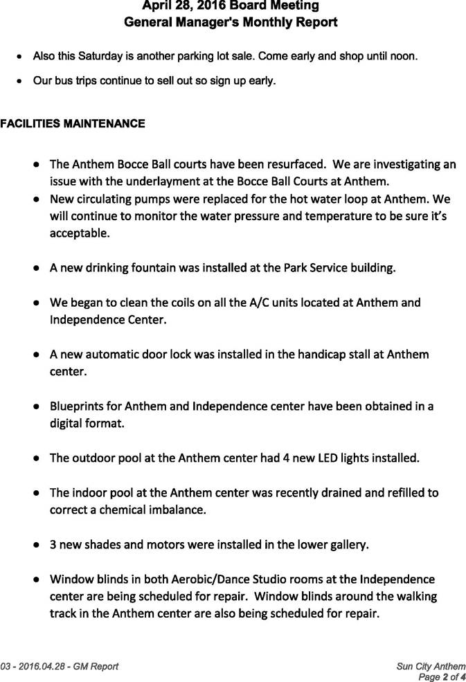 FACILITIES MAINTENANCE The Anthem indoor pool & spa had its semiannual maintenance performed this month. The re-plastering of the indoor and outdoor spas at Anthem are scheduled to start after Liberty re-opens. The 4 new Pool and Spa chemical controllers for Anthem are being installed. The 4 for Liberty are scheduled for installation next week. Half the outdoor patio furniture for Anthem has been returned refinished and re-strapped. The second half has been picked. We plan on having the second half re-strapped the same way as the first half, with the blue accent color. The new Envise smoke controllers for Anthem have been installed. Final testing is being scheduled. The coating of the concrete area outside the entrance doors at Independence is complete. The 16 new arm chairs for the Emerson/Franklin room at Anthem have been delivered and put into use. The 4 new pool tables for Anthem have been ordered and should arrive in the next 3 weeks. The repair to the 7 at Independence is being scheduled. The replacement of the rubberized flooring in the strength room at fitness is scheduled to be installed after Liberty re-opens and the work on the Locker rooms begin here at Anthem. All new Handicap signs have been installed in the parking lot between Anthem and Independence. New pool signage is being ordered for both Anthem and Liberty. The existing signage is faded and needs to be updated with current CPO (certified pool operator) names and license numbers. The balance of the Bocce Ball courts here at Anthem have been repaired. The city of Henderson’s Life Safety inspector was out this month and inspected Anthem for any Life Safety violations. None were found. Desert Fire performed Stand pipe flow testing at Liberty this month. Everything passed. Siemens, our File Life Safety vendor tested all our smoke detectors at Anthem this month and everything passed. An extra 2 sets of new drapes are being ordered for SCA TV. These will be fire treated. New lights are being installed in the fitness cardo room and the walking track. These lights will be brighter. Diamond plate has been installed in the hall behind the Delaware room to help protect the walls form damage. New walk mats have been put into place between the indoor pool and locker rooms here at Anthem to help prevent slipping. Palm Tree trimming here at Anthem is scheduled for next week. New plant material is scheduled to be planted at Liberty before it re-opens. Also, all the trees have been trimmed. CMC projects (AMOR)